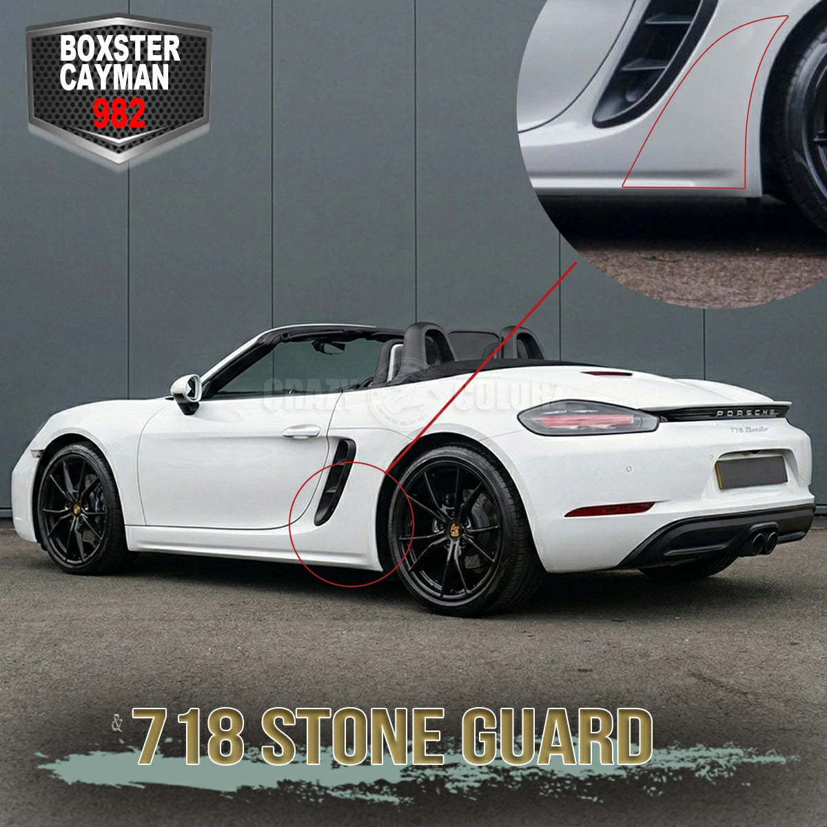 ポルシェ 718 Boxster / 718 Cayman(982世代)標準ボディ向けに設計された、リアフェンダー用ストーンガードプロテクションフィルム左右セットです。